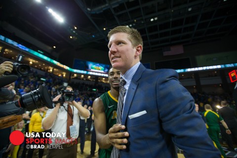 Mar 10, 2015; Sioux Falls, SD, USA; North Dakota State Bison head coach David Richman celebrates their win against the South Dakota State Jackrabbits during the championship game of the Summit League Conference at Denny Sanford Premier Center. The North Dakota State Bison beat the South Dakota State Jackrabbits 57-56. Mandatory Credit: Brad Rempel-USA TODAY Sports