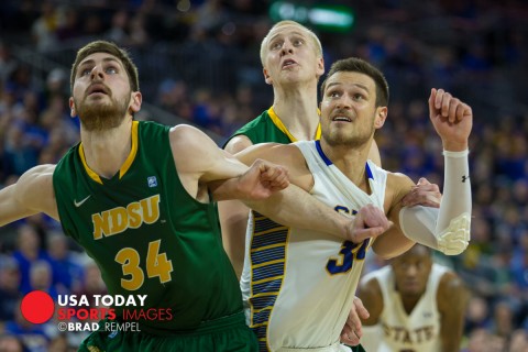 Mar 10, 2015; Sioux Falls, SD, USA; North Dakota State Bison forward Chris Kading (34) and South Dakota State Jackrabbits forward Cody Larson (34) rebound in the second half during the championship game of the Summit League Conference at Denny Sanford Premier Center. The North Dakota State Bison beat the South Dakota State Jackrabbits 57-56. Mandatory Credit: Brad Rempel-USA TODAY Sports